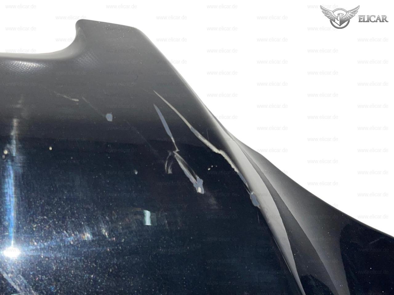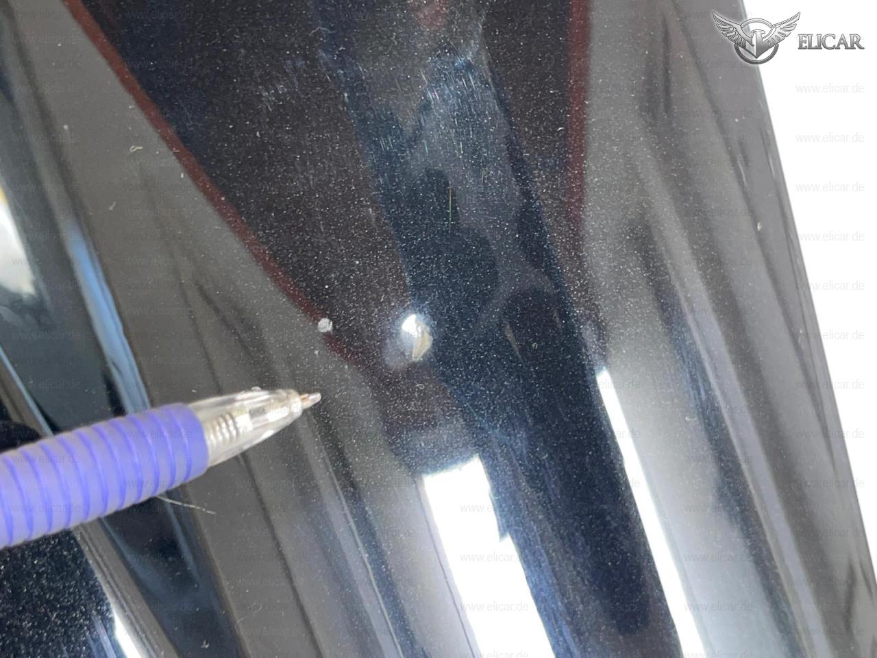 Die Motorhaube weist Kratzer und eine Delle auf.